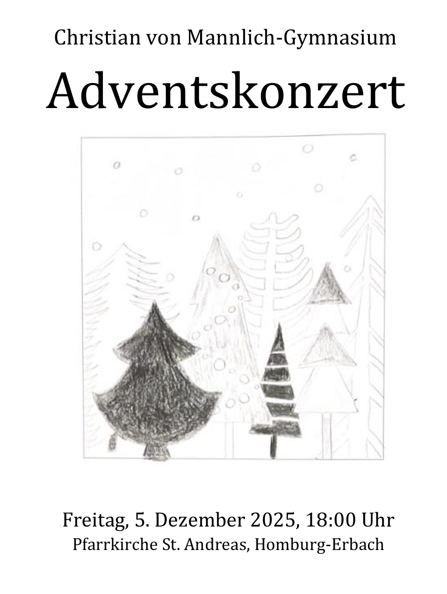 … so auch findet auch unser Adventskonzert am 5.12.2025 um 18 Uhr in der St. Andreas Kirche in Erbach statt. Kinderchöre der Klassenstufen 5-7 tragen Weihnachtslieder vor. Verschiedene andere Ensembles präsentieren ebenfalls weihnachtliche Musikstücke.