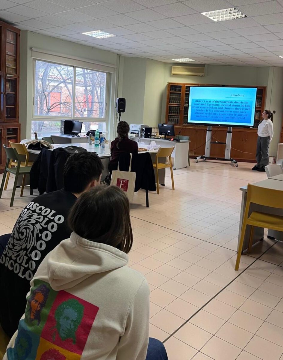 Der erste Schultag in Albano Laziale startete mit der Erasmusgruppe der Partnerschule Liceo Ugo Foscolo. Einzelne italienische Schülerinnen und Schüler sowie Lehrkräfte stellten zunächst das italienische Schulsystem im Allgemeinen, das Liceo Ugo Foscolo im Speziellen sowie die Stadt Albano Laziale und die regionale Tradition des Karnevals vor. Diesen Präsentationen schloss sich ein Vortrag Annas an, in welchem sie das Mannlich Gymnasium und die Stadt Homburg präsentierte. Dabei wurden bereits Gemeinsamkeiten und Unterschiede zwischen dem italienischen und deutschen Schulsystem deutlich, die im anschließenden Gespräch weiter vertieft wurden. Als besonders lustig empfanden unsere italienischen Partner*innen das Konzept „00“ im Sinne einer doppelten Null als schlechteste Note.